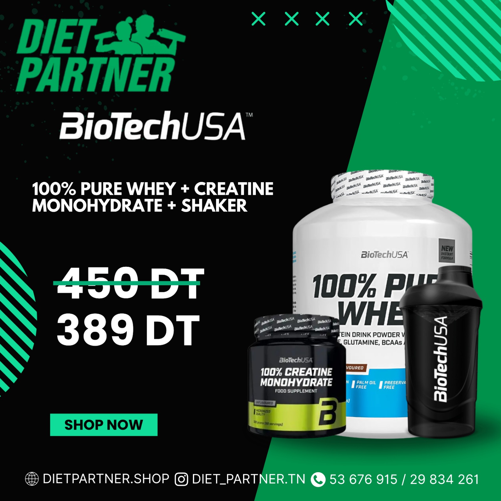 Le combo ultime BioTechUSA est enfin en promo : 100% Pure Whey + Créatine Monohydrate + Shaker… le tout à un prix qui défie toute concurrence .